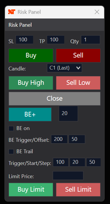 - **BE+** – Manual break-even plus: move stop to entry + X ticks; each additional click moves the stop another X ticks in profit direction.
